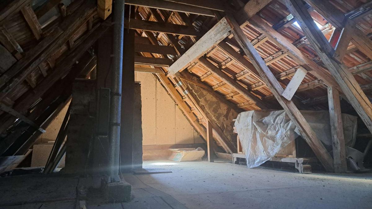 Das Dachgeschoss ist teilweise ausgebaut und umfasst neben dem Dachstuhl zwei kleine Zimmer, eine Dusche mit Waschbecken sowie ein separates WC – praktisch als Rückzugsbereich oder für Gäste.